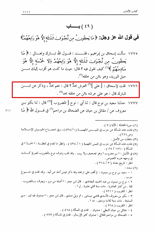 "Я (Харб аль-Кирмани) спросил Исхака: «(Аллах находится над) Троном, имея границу?» Он сказал: «Да, имея границу». И упоминают, что Ибн аль-Мубарак говорил: «Он над Своим троном, отделён от творений границей»" («Масаилю Харб», 3/1111).